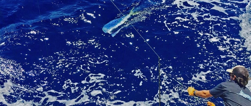 HAVING MULTIPLE SPINNING RODS RIGGED AND READY IS KEY. A LARGE SCHOOL OF MAHI WILL EAT JUST ABOUT ANYTHING.